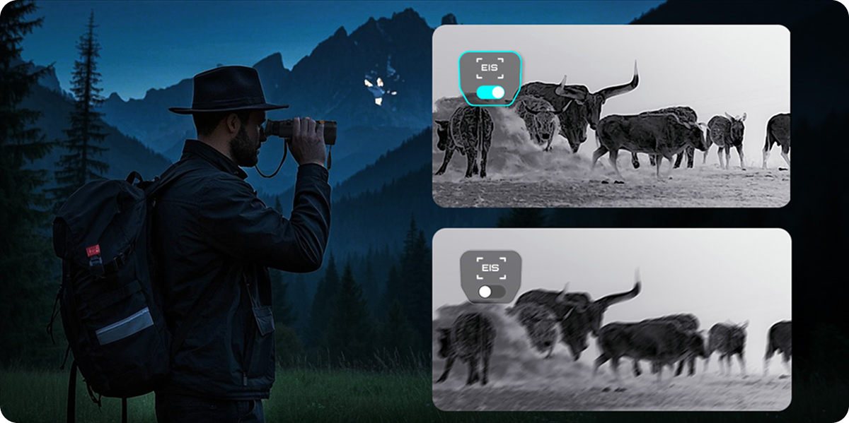 RIX Titan kasutab EIS-i (elektrooniline pildistabilisaator), mis vähendab värisemist ja hägustumist tänu sisseehitatud liikumisanduritele ja nutikatele algoritmidele. Olgu vaatlus liikudes või sõiduki vibratsiooni tingimustes, Titan tagab alati stabiilse ja mugava vaate.