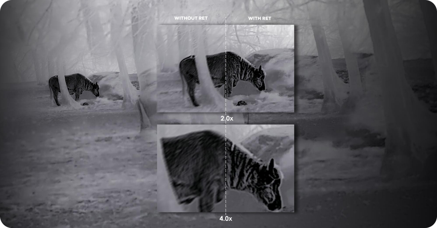 RIX Titan kasutab RET-tehnoloogiat, mis rakendab täiustatud AI-algoritme, et parandada pikslite detaile digitaalse suurendamise ajal. Tänu sellele säilib pildi teravus ja selgus ka suure suurenduse korral, erinevalt tavapärastest seadmetest, kus suurendamisel pilt hägustub või muutub piksliliseks.